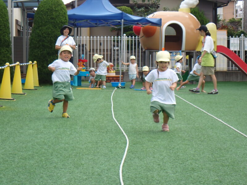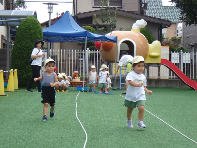 蒸し暑さはあるものの、太陽が隠れて外遊びのチャンス!運動会の取り組みも🏃「位置について ヨーイ ドン!」の練習も✨ヨーイで足を下げ走るポーズを教えてもらいました!