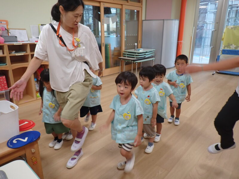 お昼を食べ、こっこ組さんがさよならした後、みかん組さんはもうひと頑張り💪運動会の取り組みで一列並びごっこ✨