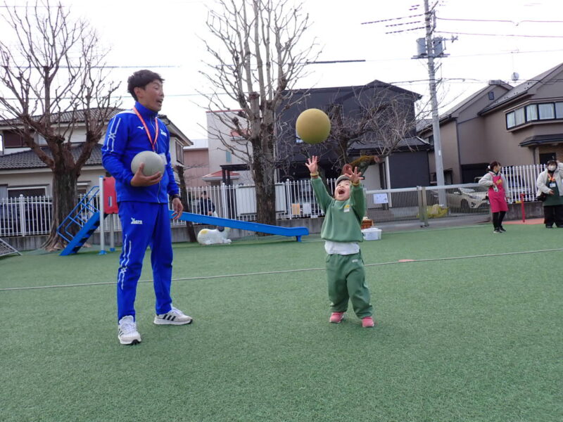 ↓ 上に高ーく投げ上げる運動。とても高く投げられるお友だちがいるからお見本で見せてもらいましょう☆
