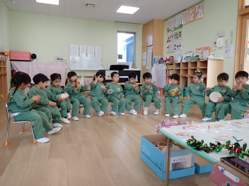 タンバリン、すず、カスタネットの中から一つ選び、クリスマスソングのリズムに合わせてならします。