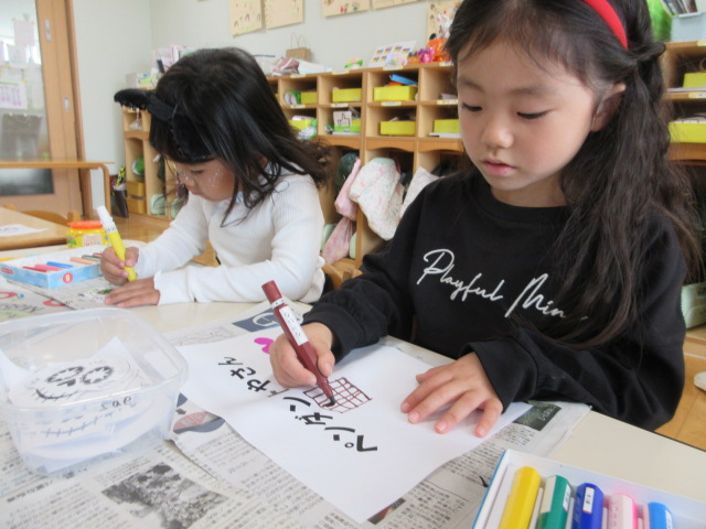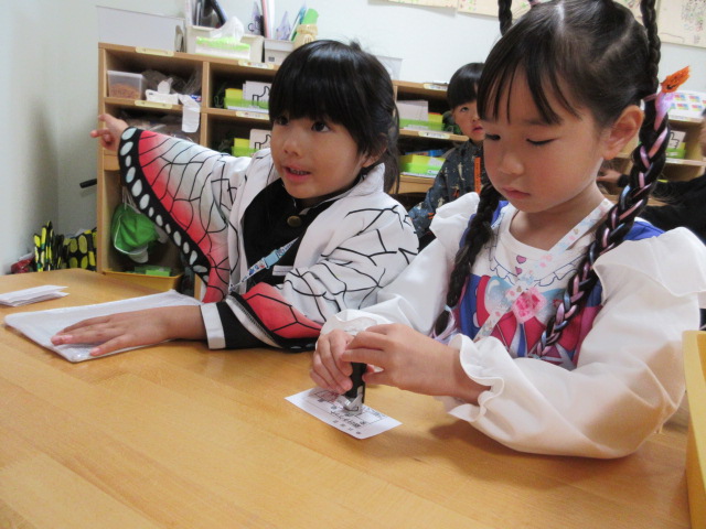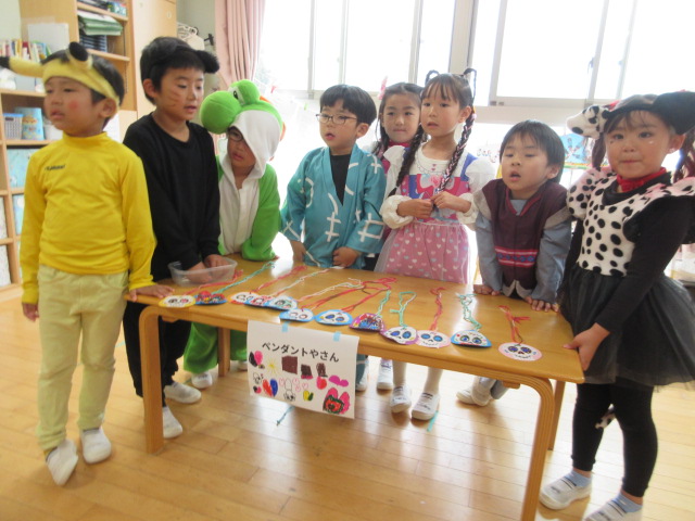 朝から【キッザニアごっこ】で、①ペンダント屋さん ②ハートの折り紙屋さん ③外郎売教室 と出かけて行ったり、午後は、作った【ペンダント】を小さいお友だちに販売する【お店屋さん】となり、呼び込みも売り込みも楽しんでいました(o^―^o)ニコ