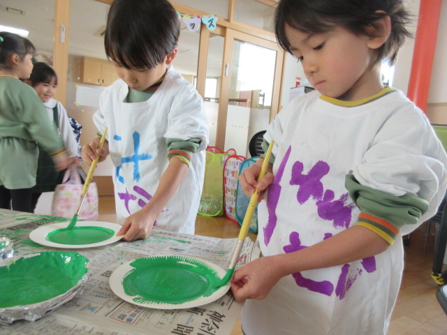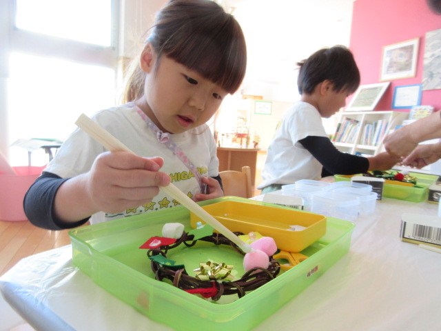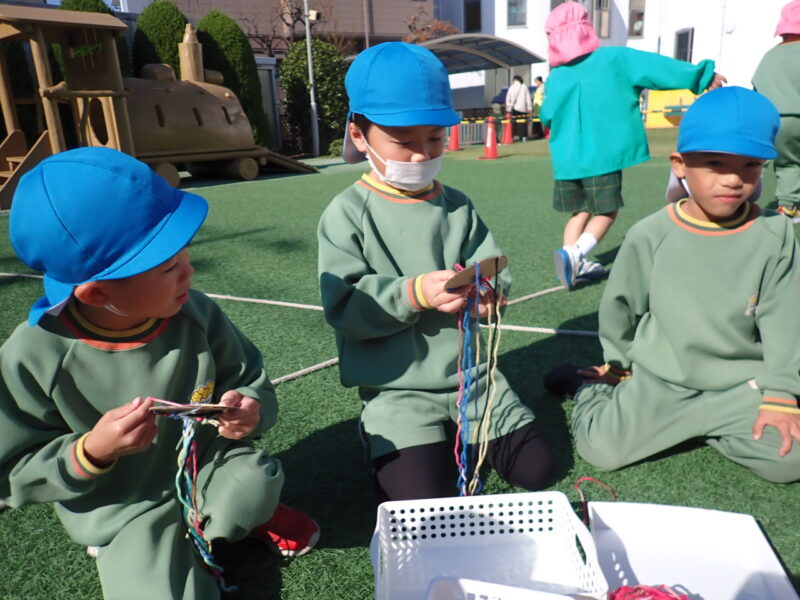 ミサンガづくりは、園庭で。ポカポカ陽気で、ゆったりと製作していました。「先生、まだ大丈夫?」時計を見るのも忘れなくなったね。男の子も結構はまっています。