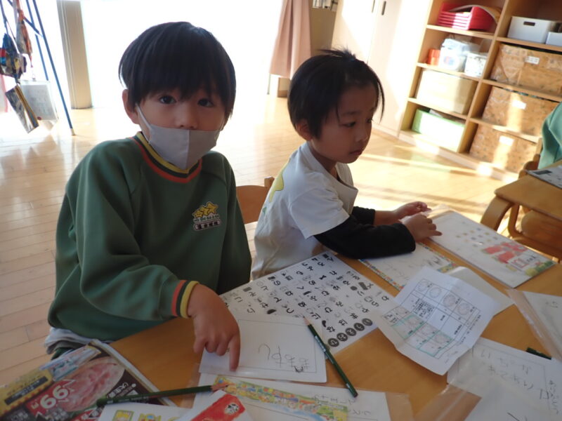 23日は、「勤労感謝の日」めざましあそびの教材「お手紙ごっこ」の手紙セットを使って、お家の方へお手紙を書きました。「先生、ゆってどう書くの?」等、平仮名の表を見ながら、一生懸命「感謝💛」の気持ちを書いていました。