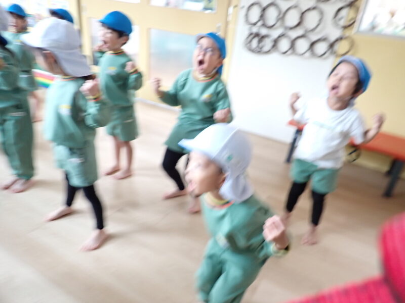 体育あそびの時間に、2回目の「運動能力テスト」がありました。元気いっぱい準備体操🎵