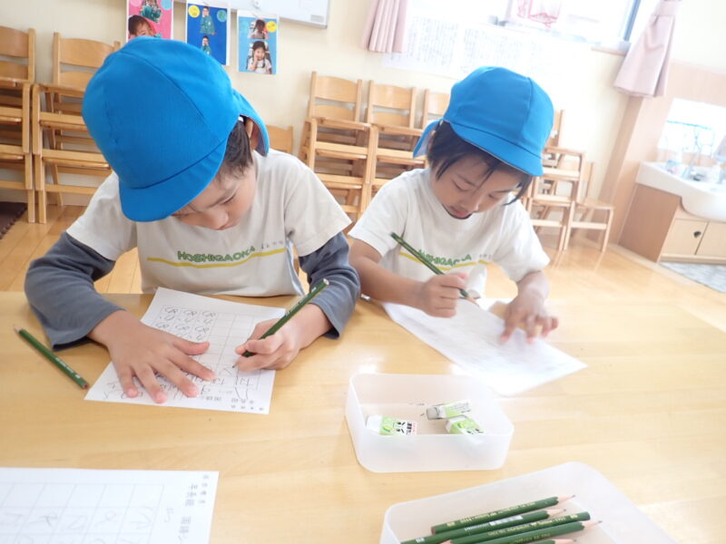 大塚先生が測定して下さった記録を、1学期に測定した記録と比べながら記入していると、殆どのおともだちが記録更新しているのに驚きました。運動会でのリレーやマスゲームの取り組みの成果でしょうか。特に、立ち幅跳びは、自分の身長よりも遠く147㎝!というお友だちもいて、「お~~っ!」と、皆で歓声を上げました。おともだちのパワーももらえたね。