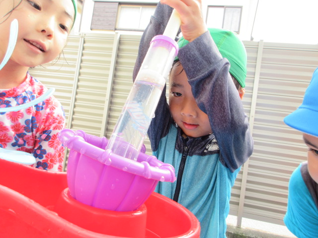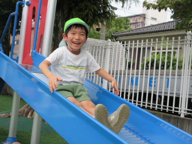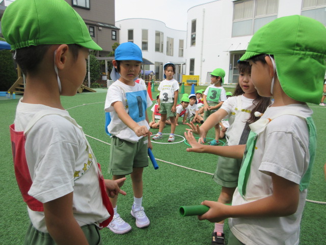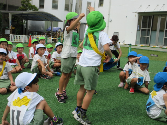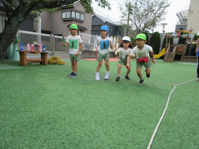 午後、少し日が陰ったので、リレー対決を園庭で!