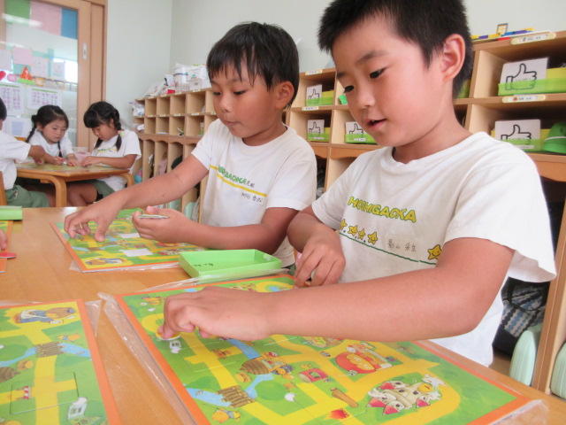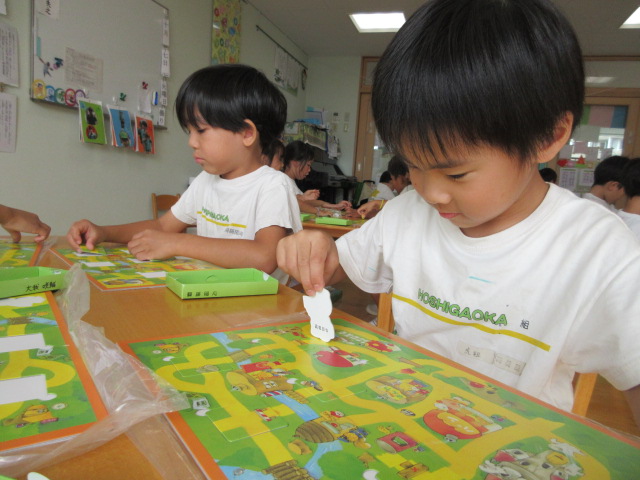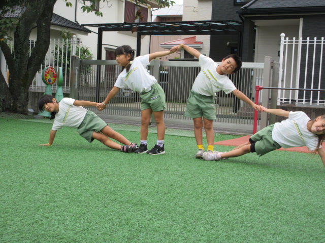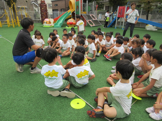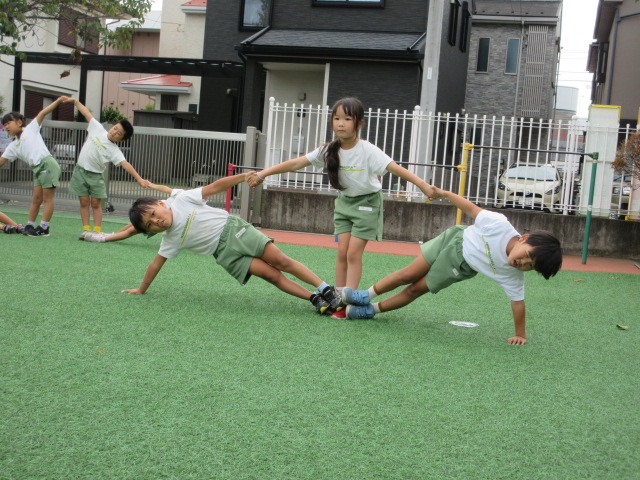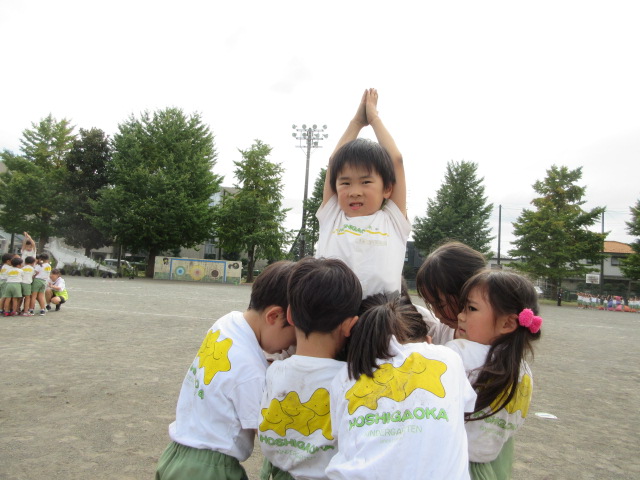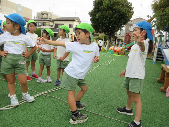 「もっと、大きな丸にしなきゃ!」「青いマットが真ん中になるようにだよ!」と、お互いに声を掛け合って頑張っています。
