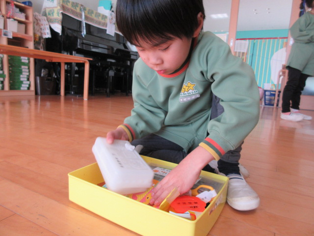 道具箱を恐る恐るあけると…何やら、折り紙・テープ・紙と、お土産が沢山入っていたので、綺麗にお片付けしました!
