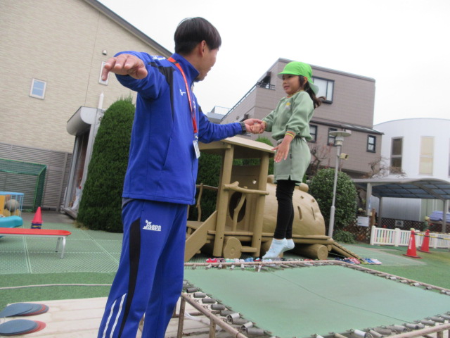 体育講師や担任と ①両手を繋いでjump ②片手だけ持ってjump ③自分のチカラでjump