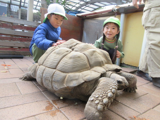 今日は、アルダブラゾウ亀の『ともちゃん』が出てきてくれました!あまりの寒さに、ピースちゃんやリボンちゃんは、お部屋の奥の方でぬくぬくタイムだったようです。