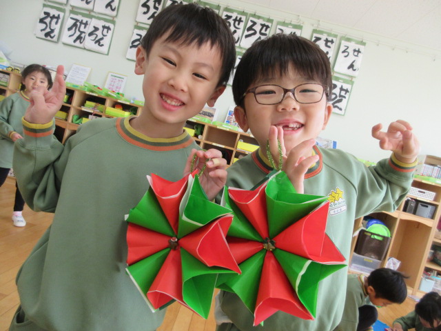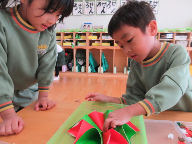「僕は、星が丘幼稚園のマークにしよう!(星の形(笑))」、「私、チョッパーにしようかな?(トナカイ(笑)。)」と、恵子先生が準備して下さった可愛いクリスマス飾りの中から自分のお好みの”Xmas飾り”を選んで、ホットボンドでぺったんこ🎅