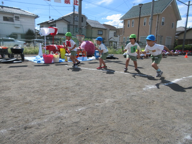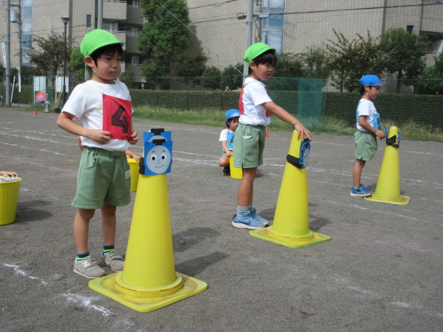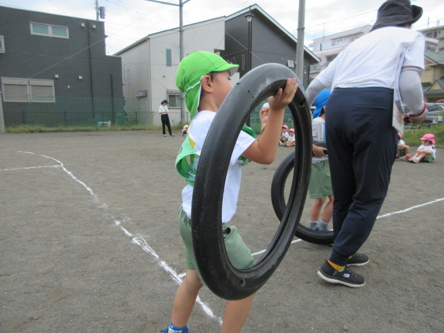 年中組さん かけっこ 【整列の声掛け・タイヤ片付け】のお手伝い🎵