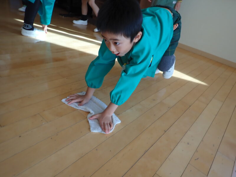 ロッカーの中、お道具箱の整理も終わって、次は、毎日使っている椅子を拭き拭き。特に、脚の裏をよく擦って汚れを落としました。同じロッカーのお友だちと、「ここもだよ。」と、隅々まで丁寧に😊。