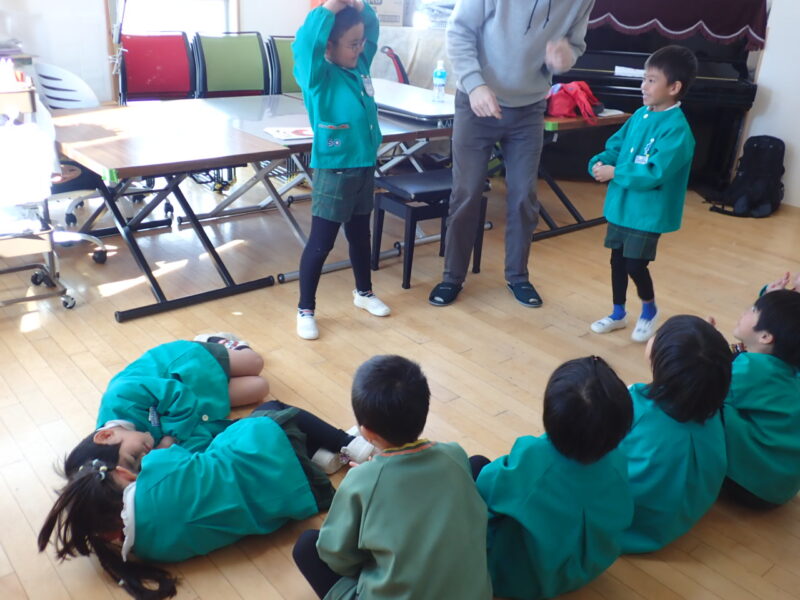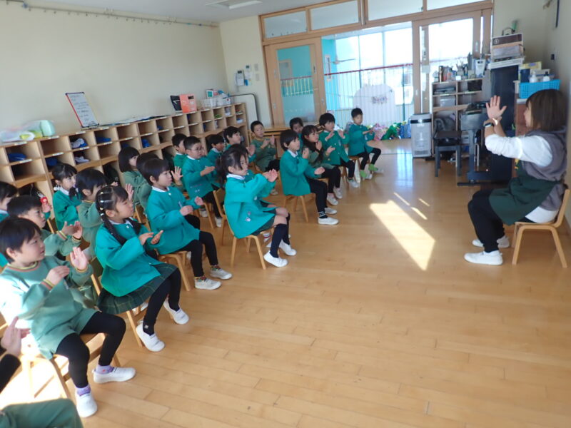英語あそびの前に、三枝先生から、「ビリーブ」の手話を教えて頂きました。「早く知りたい!」そんな思いがあったおともだちは、取り組みも真剣。お話が出来ない方との会話の手段である「手話」。色々な手の動きに意味があることを歌いながら覚えていきました。3学期の取り組みが楽しみです。おともだちと反対の動き!頑張って覚えるね💦。