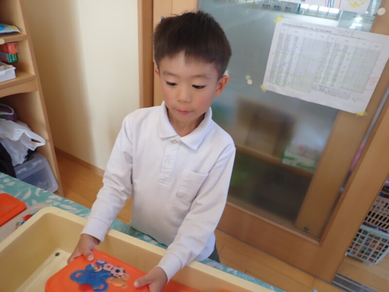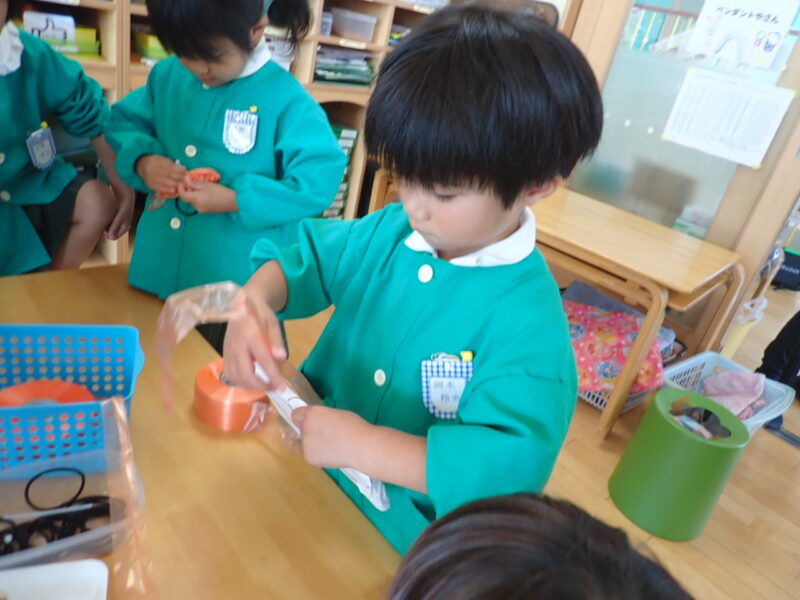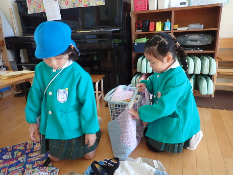 今日は、金曜日。持ち帰りの物や配布物をお道具袋に入れるお手伝い。「何かお手伝いありますか?」が自然と言葉に出てきています。