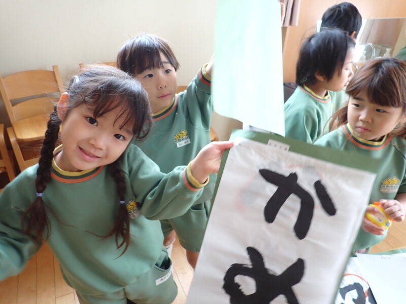 昨日の習字を、台紙に貼りました。今回から3枚!貼り方を確認して「大丈夫?」おともだちは「大丈夫!」・・・でも、1枚増えると大混乱!!先生の赤筆でご指導頂いた2枚の上に清書を貼るのですが、字が裏表になったり逆さになったり💦。先に終わったお友だちが、一緒にお手伝いしてくれて「ありがとう。」