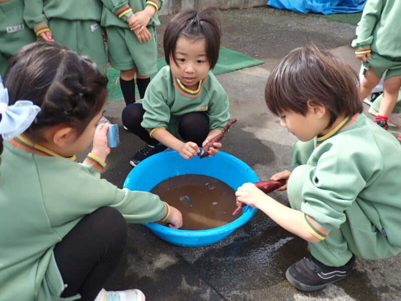 明日は「お芋パーティ」。収穫したお芋を、中庭で綺麗に洗いました。お水が冷たいので、ちょっとお湯を足して♨・・・。「お芋の皮は薄いので、スポンジで優しく洗ってね。」と、伝えると、そっと撫でる様に洗っていましたよ🍠。洗い方が慣れて来ると、次々お芋を持って来ていました。明日のお芋パーティが楽しみだね。