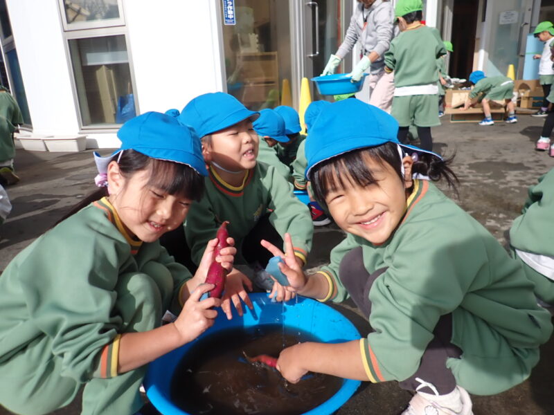 明日は「お芋パーティ」。収穫したお芋を、中庭で綺麗に洗いました。お水が冷たいので、ちょっとお湯を足して♨・・・。「お芋の皮は薄いので、スポンジで優しく洗ってね。」と、伝えると、そっと撫でる様に洗っていましたよ🍠。洗い方が慣れて来ると、次々お芋を持って来ていました。明日のお芋パーティが楽しみだね。