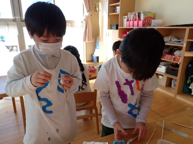 習字を待つ間、声優教室でご指導頂いた「割りばしバチ」を作りました。作り方は、割りばしに、ティッシュを丸めて芯にして、アルミ箔でカバーをし、セロテープで止めて出来上がり。両手に持って「ちょっと先の・・・。」と、外郎売が始まりました。バチの動きが同じなので、リズム・発声も揃って気持ちいい!バチを振りながら、いろんな言葉を言って楽しんでいましたヽ(^o^)丿。
