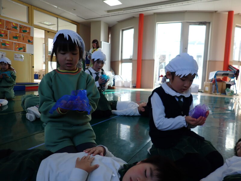教室で、ハウルごっこ。給食を食べてからは、ホールでも取り組みました。三枝先生、町田先生、川崎先生、高山先生も裏方、表現とご指導頂きました。ありがとうございました。取り組みの前に、「遊ぶ?ハウルやる?」の、問いかけに全員一致で「やる!」の意気込みがありました。台詞のタイミングは、おともだちが言いやすい所に変更したり、もっと広がるには、どうやろう。ご指導頂いたけど、ちょっと間に合わないかな・・・まだまだ、取り組むところはいっぱい!だけど、「楽しくなってきた・・・。」と、ポツンとkさんの声に、いいね!。楽しもうよ!!。