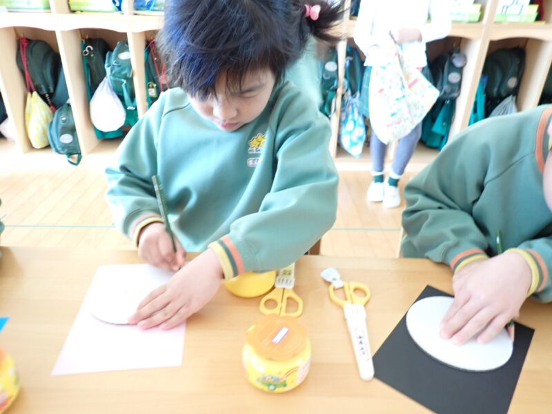 「(鬼の形の)でんでん太鼓作るよ!」~丸い型紙に好きな色の色画用紙を丸く型どり。押さえる手が動いてしまうと綺麗な丸が描けない・・・でも、みんな上手に型に沿って線が描けていました。
