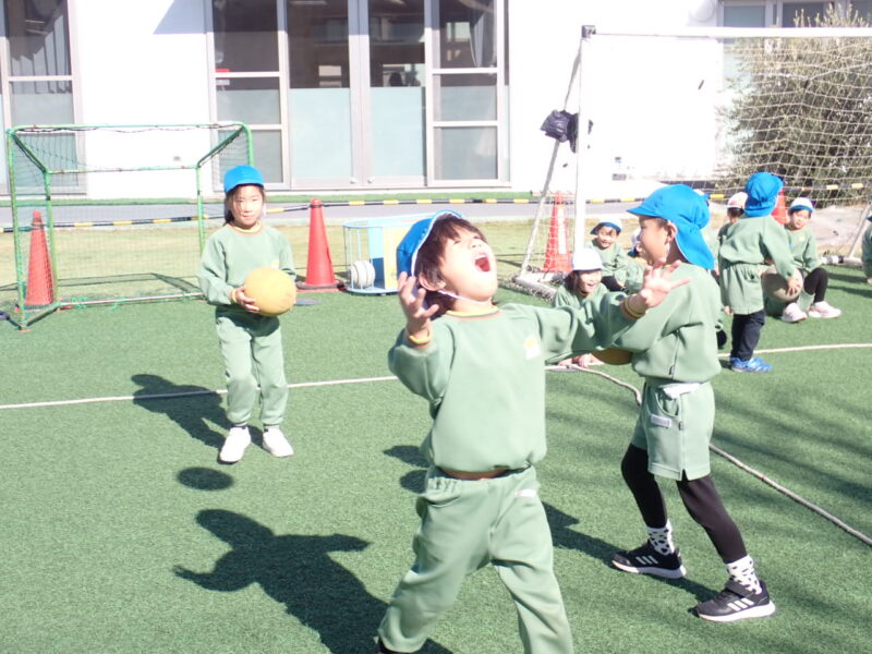 今日から、体育あそびは「ボール運動」。3月には、ドッジボール大会がありますヽ(^o^)丿。最初は、ボールを高~く上げて取ることから。