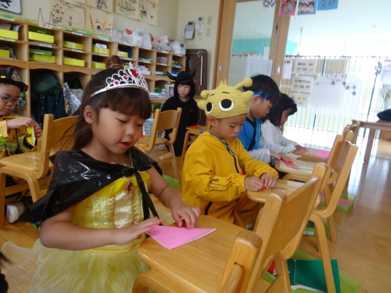 ウキウキで登園してきたおともだち。嬉しくて、楽しくてお喋りが弾んでいました。今日は、衣装のままキッザニアごっこが始まりました。メロディオンを行い、フードチケットをもらいます。今日のお仕事は、「外郎売」と「リメンバーミーペンダント作り」と「折り紙のハートのリース作り」。3つのお仕事で1キッゾです。どの時間で出向くかを相談センター(担任)としてから出かけて行きました。