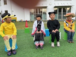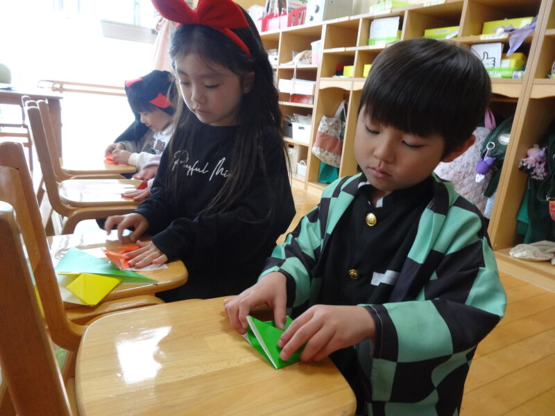 ウキウキで登園してきたおともだち。嬉しくて、楽しくてお喋りが弾んでいました。今日は、衣装のままキッザニアごっこが始まりました。メロディオンを行い、フードチケットをもらいます。今日のお仕事は、「外郎売」と「リメンバーミーペンダント作り」と「折り紙のハートのリース作り」。3つのお仕事で1キッゾです。どの時間で出向くかを相談センター(担任)としてから出かけて行きました。