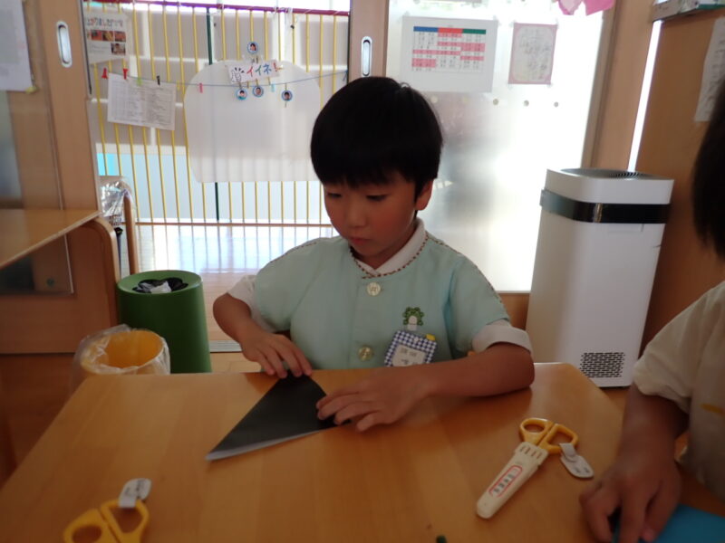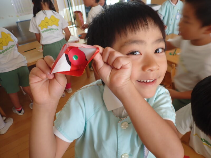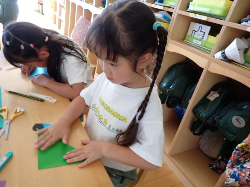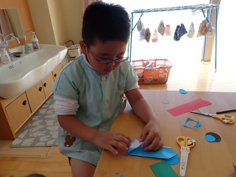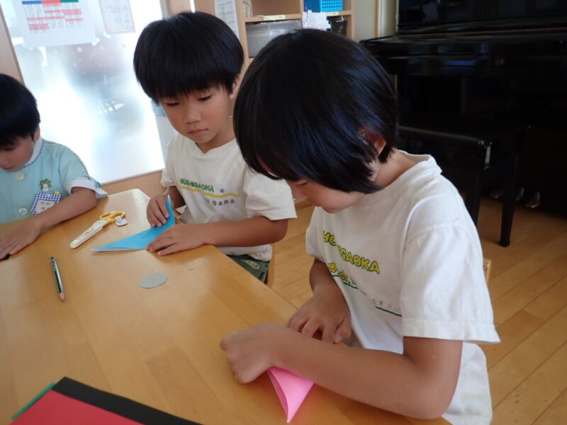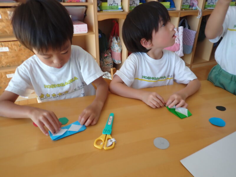 ちょっと難しい所は、線を引いてあげて・・・隣の机を見て、折り方をチェックしていたおともだち、「先生こうでしょ!」とどんどん進めていました。