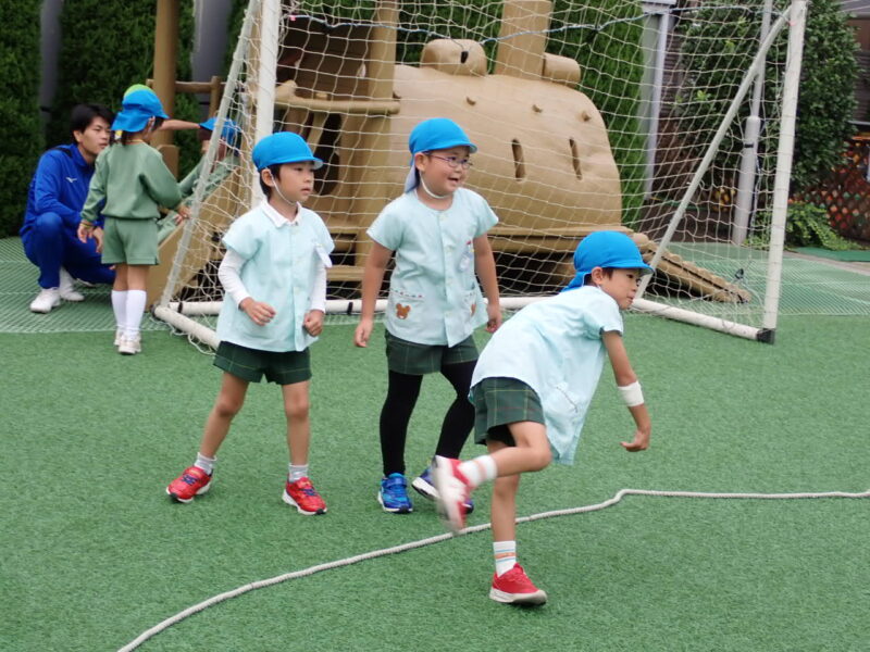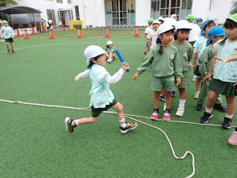 他の学年のお友だちも出て来たので終了。クラス関係なく自分の組帽子のお友だちを、一人ひとり声援して、運動会とは違う楽しいリレーでした。