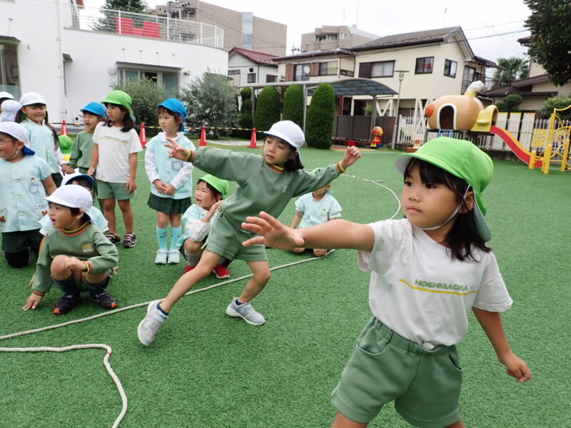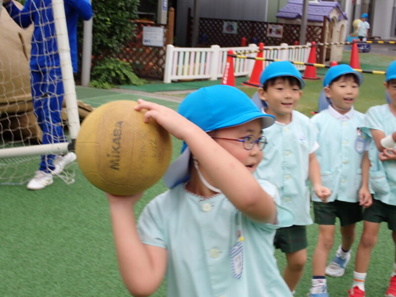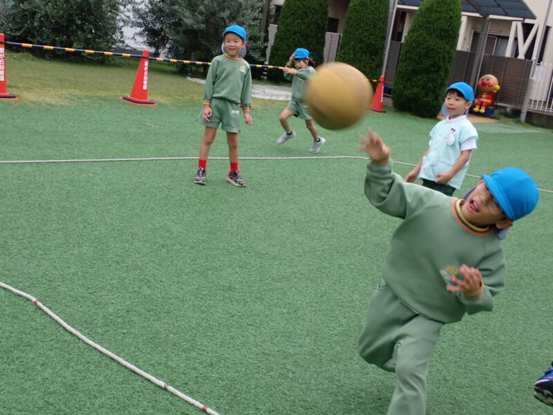 小雨模様でしたが、朝のお外遊びへ元気に出発!虎組さんと一緒に遊び始めると、ドッジボール派とリレー派に分かれてどちらも引かず・・・。時間を決めてやることになり、ドッジボール派がじゃんけんで勝ったので、まずは、ドッジボールから。