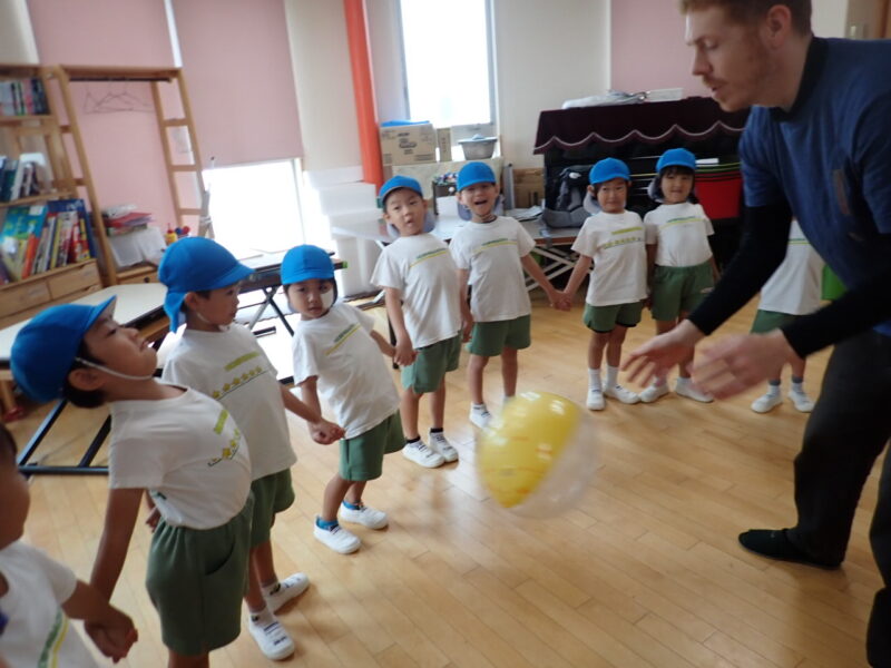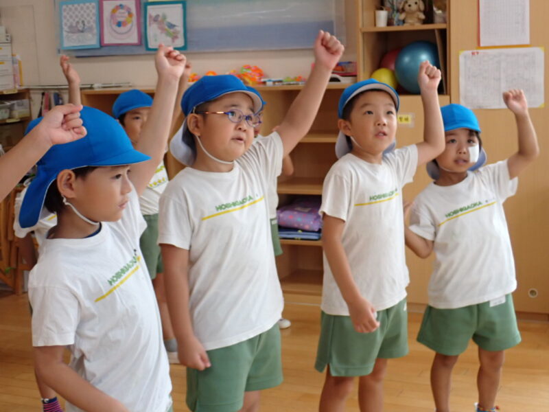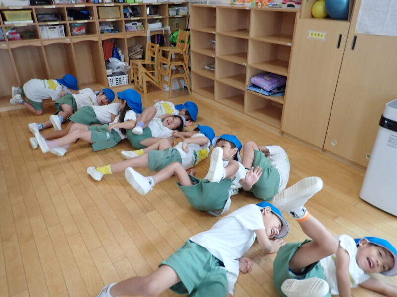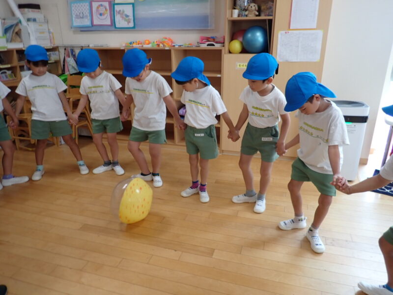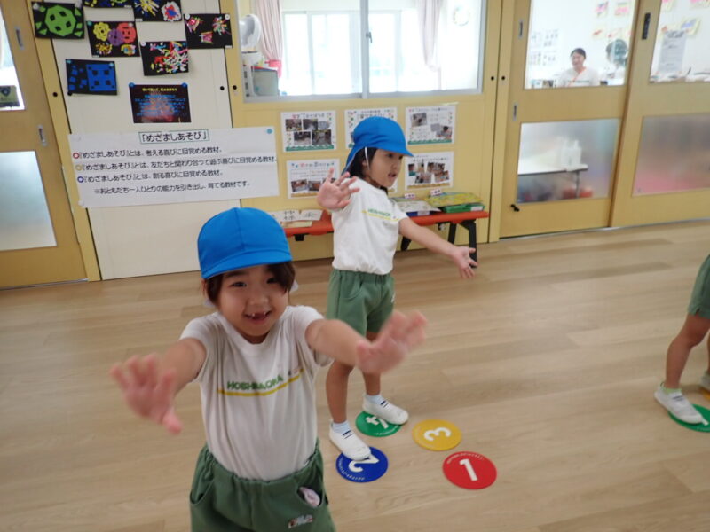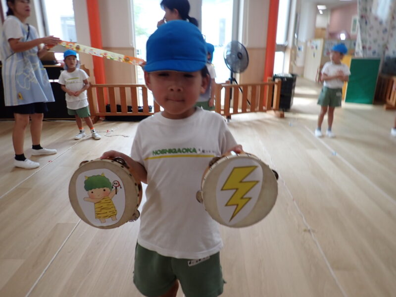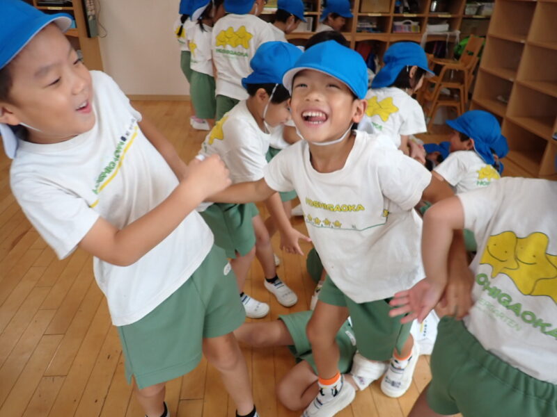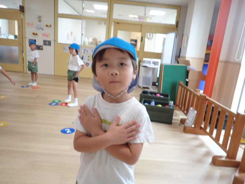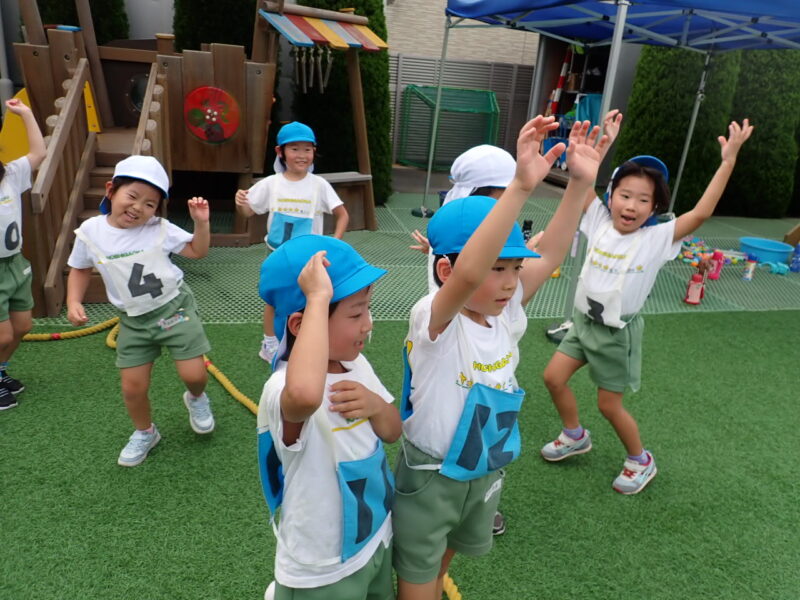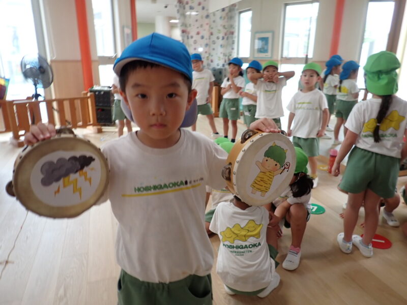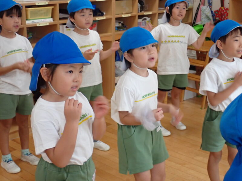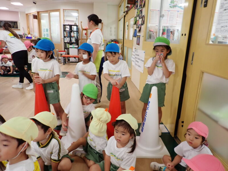 ホールに移動して、年少組さん・年中組さんの運動会のお手伝いをしました。