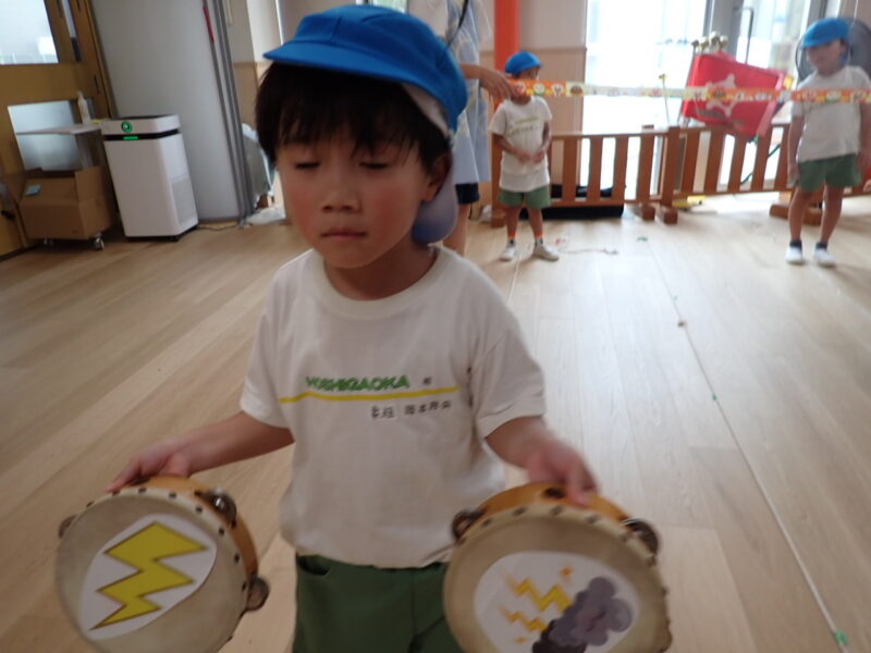 かけっこのお手伝い。「ここまで走って来てね。」タンバリンを持つ役目のおともだち。