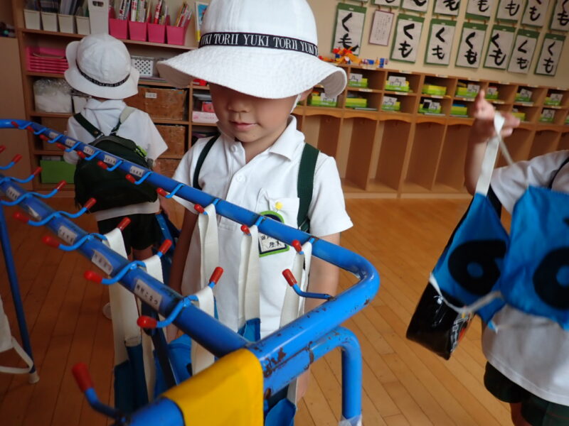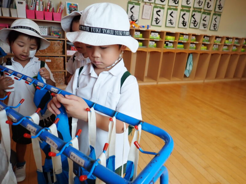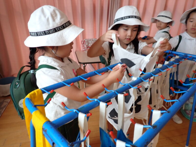 降園前に、箭内先生が洗濯して下さったゼッケンをお迎えのおともだちで干しました。「明日も宜しくね!。」
