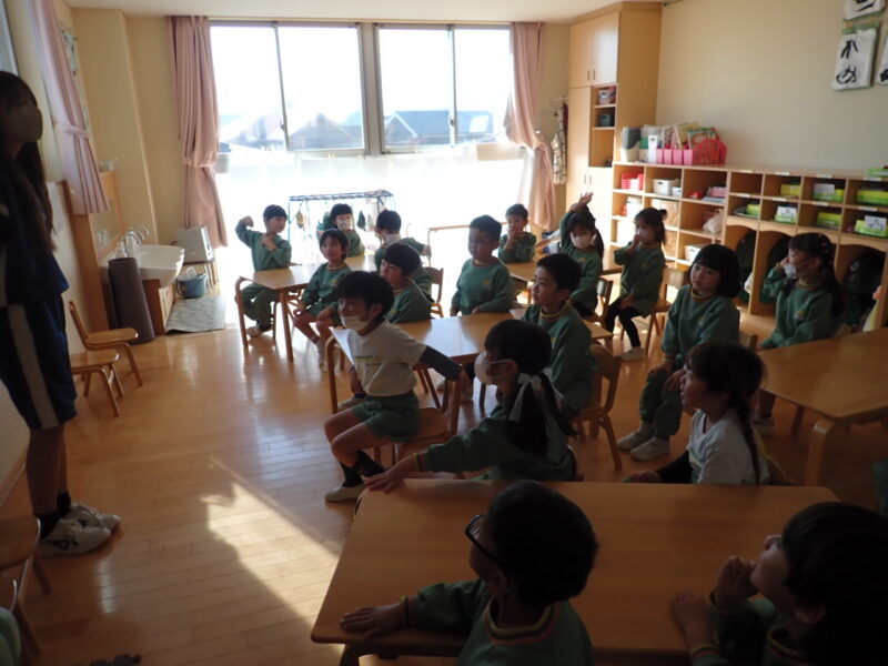 象組には、お姉さん先生が1人来てくれました。「インタビューにいくつ答えてくれますか?」の質問に、「ブドウが好き」「英語が好き」等、「5つ」の質問に答えてくれました。明日迄という事で、ちょっぴり寂しそうなおともだちでしたが、ビオラの水やりや外遊びを一緒に楽しんでいました。