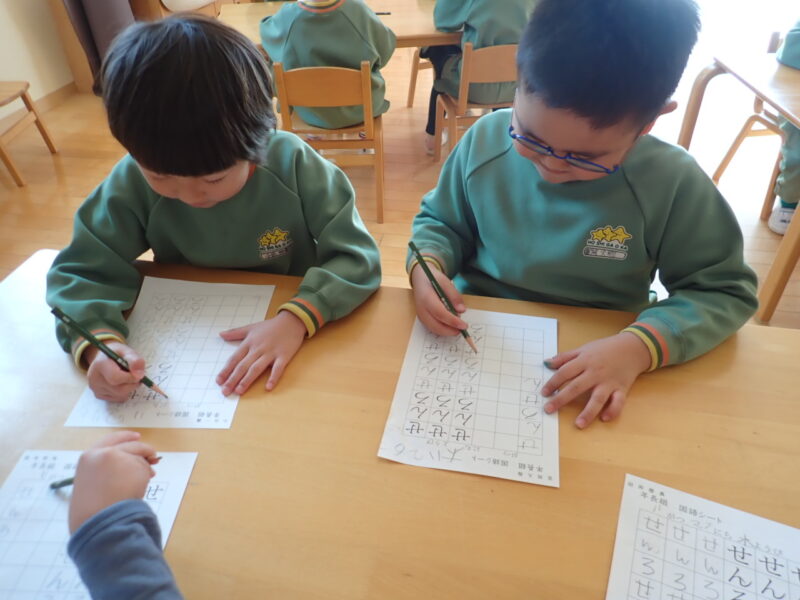 【国語シート】は、「せんろ」の3文字になりました。「書き順知ってるよ。」「ろの所は゛つき”とおんなじみたい。」 「゛ん”は上から斜めだよ。」と、得意気にお話していました。お家でも平仮名に興味が出てきて「書いてます。」の声が聞かれます。平仮名の表を見なくてもスラスラ書ける様になったお友だちも増えてきましたね。