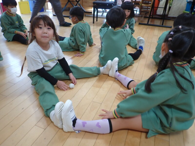 ペアになって、小さなポンポンサッカー。開いた足の間から出ないように転がすよ。可愛いポンポンボールが行ったり来たり。制限時間まで転がせればOK.「えいっ。」の声が、小さいポンポンのせいか、いつもより優しい(#^.^#)。