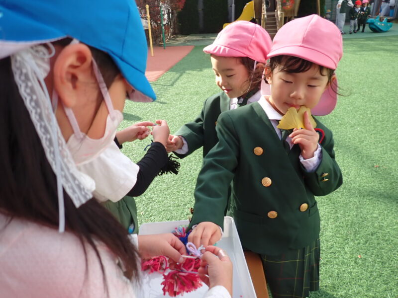 毛糸のポンポン作りが楽しくなってきて、「ポンポン作って売ろう(無料)」と、幾つも作って園庭で販売。選んでもらったポンポンを腕に付けてあげていました。「もっと作らなくちゃ!」と、教室に張り切って帰って来ました。