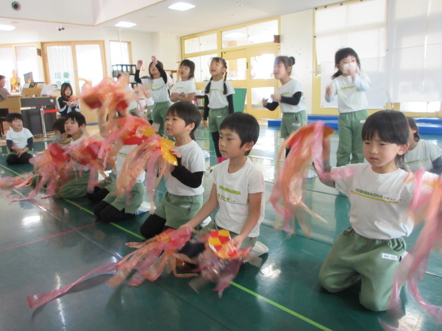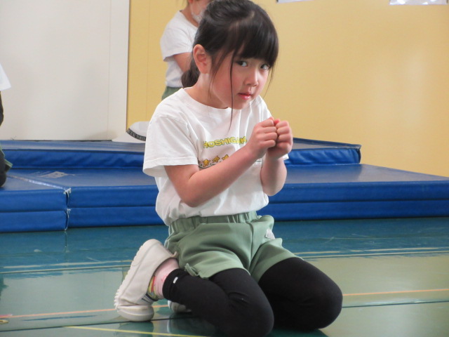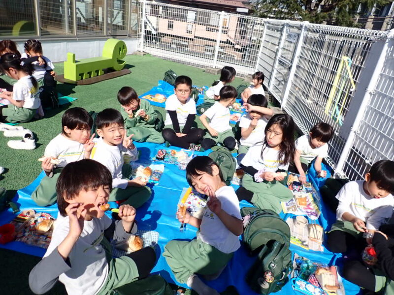 朝からリハーサルのフィナーレ、外郎売・歌、表現劇と、時間でホールに移動していました。年長さんんは、一番最後なので、終わったらお腹もすいて来た・・・「外遊びに行く?給食にする?」と、声掛けすると「お腹空いたぁ~~!」の声。外に出られなかったので、せめてもと、屋上で給食を食べました。