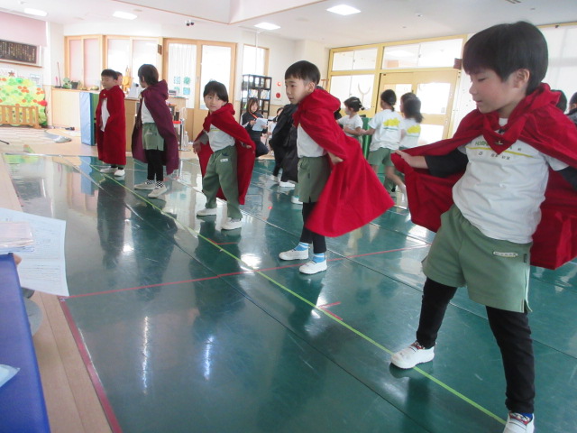 園のホールであっても、本番の様に進めるのがリハーサル。裏方の先生方が勢ぞろいでサポートして下さいました。ありがとうございました。松下先生から、マントの使い方、ハウルがソフィーの腕を取るところ、台詞の合わせ方等のご指導頂きました。昨日より良くなっているといって頂き、1日1日進化できると良いね。明日は、ポイントをもっと絞って取り組んで行こうね。