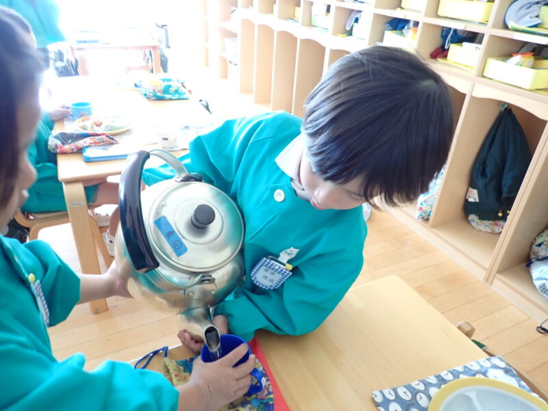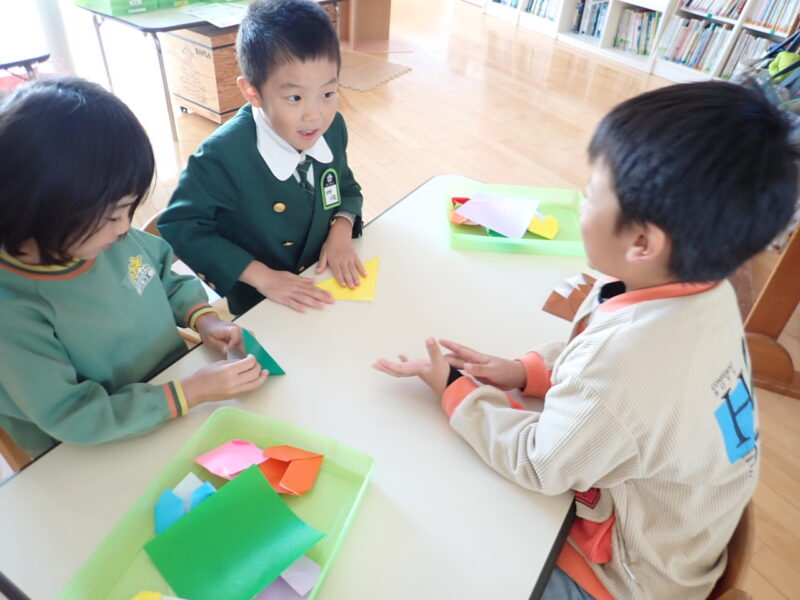 小学校の運動会の振り替え休日で、朝から小学生のお兄さんお姉さんが登園。「折り紙教えてあげて欲しいな。」と、声掛けすると、快く引き受けてくれました。流石!小学生!1度折り方を伝えると覚えて、お友だちに優しく教えていました。(ありがとう!)