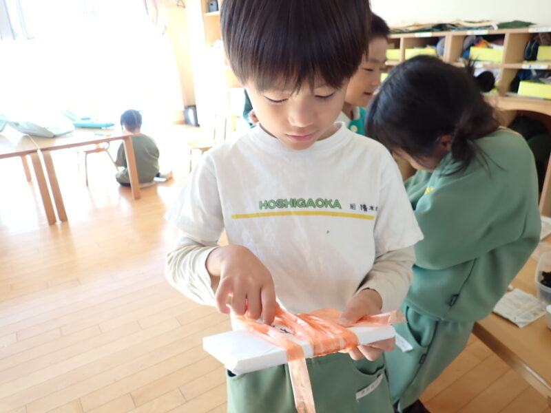 教室では、「ポンポン作り」。テープを10回巻き付けるよ。「1,2,3・・・」と数えながら上手に巻いていました。