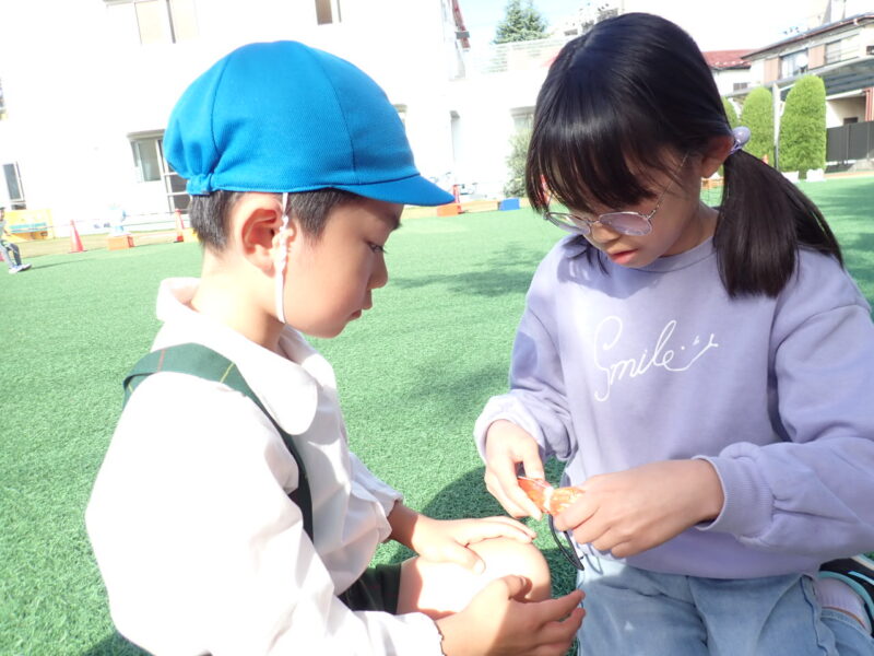 園庭でも「青空教室」難しい所を、お姉さんが押さえてくれて、お友だちの出来る所は自分でやってみる。「ここを引っ張って!」手元を見ながら慎重に・・・。。