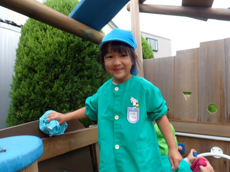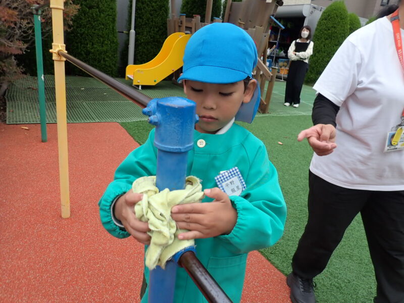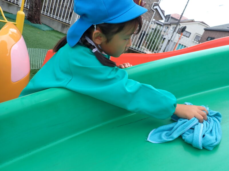 濡れた遊具を、皆が遊べる様に、川又先生と拭き拭き。ありがとう!