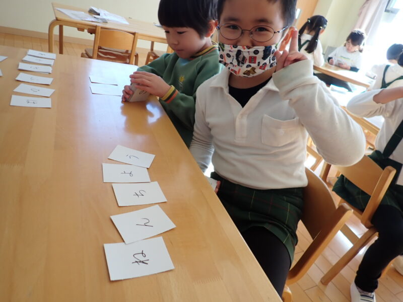 ひらがなカードを使って、自分の名前の平仮名を探してみました。「点々(濁点)はどうしよう。」「同じ平仮名を使わないと出来ないよ・・・。」そんな時、お友だちとシェアして言葉を作っていました。 家族の名前を並べて見たら「全部違うひらがなで出来たよ!」と、発見に喜ぶお友だちも!沢山のカードが混じってしまって、全部あるか確認中💦。でも、繰り返しカードを見ながら並べて、何度も言葉にしているうちに、自然と文字を覚えていっている様でした。