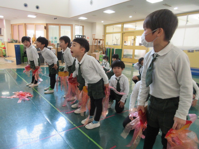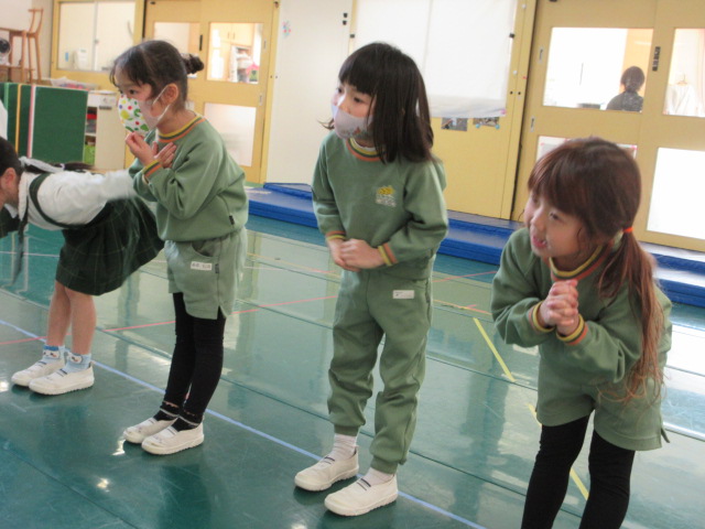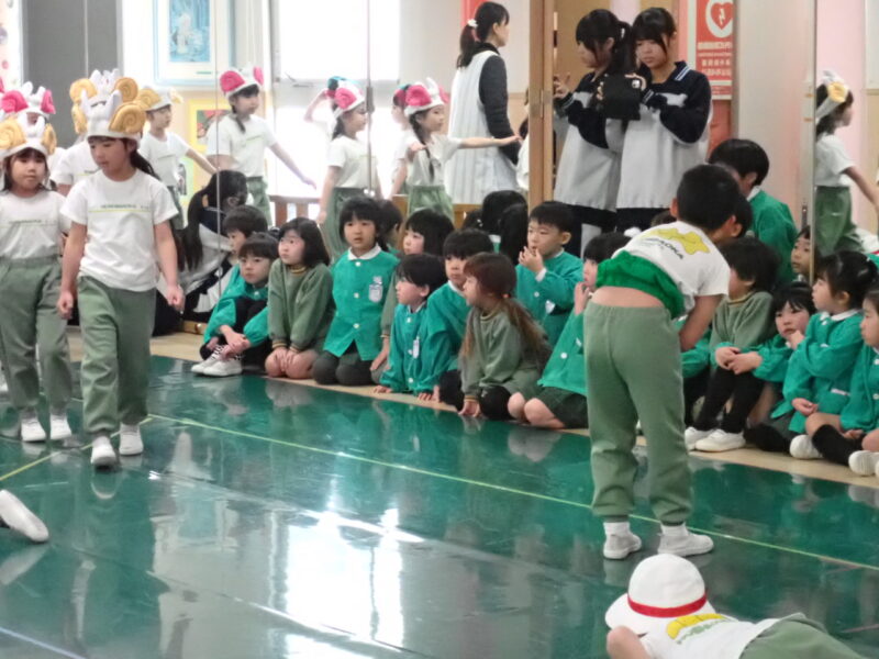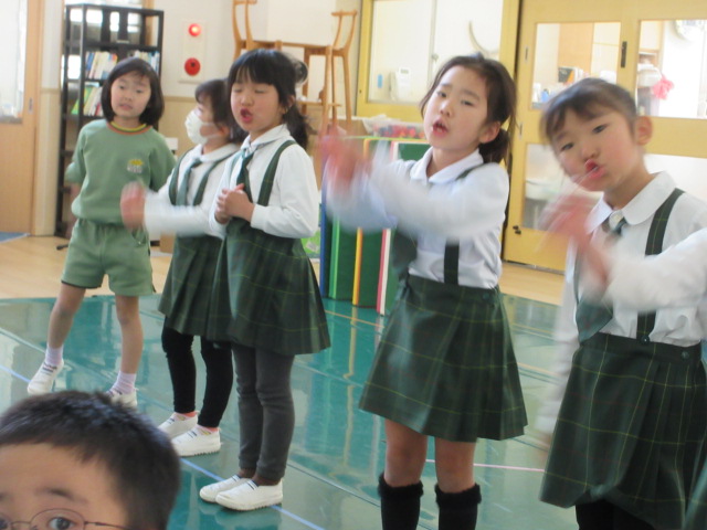 今日は、1部の園内リハーサルでした。「2部のみんなの劇の時に、お世話になったよね。今度は、1部のお友だちの劇のお手伝いをしてくるね。」と話すと、「頑張って来てね。」「行ってらっしゃい。」と送り出してくれました。昨日は、昨日はスケジュールがいっぱいだったので、外遊びの時間を出来るだけ取りたいと、桜組やみかん組が外遊びの時間に、一緒に見守りをお願いして、遊ぶことが出来ました。ありがとうございました。みかん組さんと一緒に「かごめかごめ」をしたりして交流。妹弟のいるお友だちもいたので、嬉しかった様です。