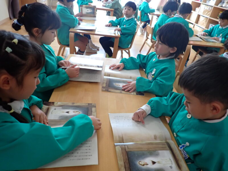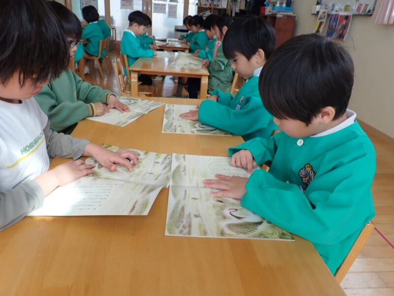 「鶴の恩返し」・・・今日も、鶴の鳴き声が上手でした。「こーっ、こーっ、こーっ・・・。」「「え~、そんなに鳴いてないよ!」と、正しく読んでいたお友だちの突っ込み。