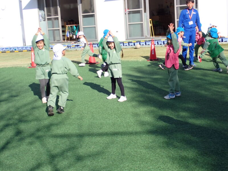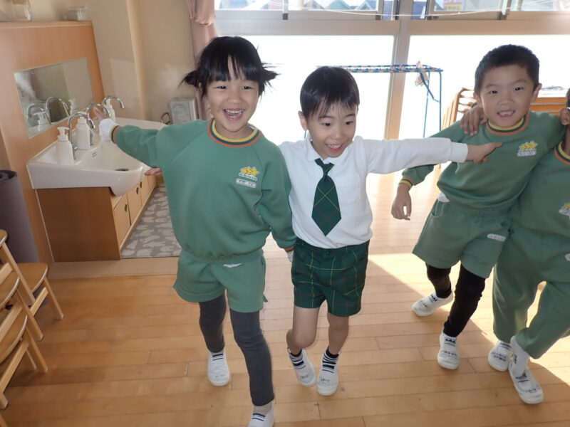 暖かな日差しの中で、体育あそびが始まりました。竜﨑先生に、色々なゲームを教えて頂いて楽しんで来ましたが、今学期最後のゲームは「3色鬼ごっこ」。ピンクと緑のランニングを着たチームと、白帽子チームの3つに分かれての鬼ごっこ。ピンクは、緑を追いかけて、緑は白帽子を追いかけて、白帽子はピンクを追いかけてタッチ。タッチされたら両手を上げて「バナナ」になります(笑)。