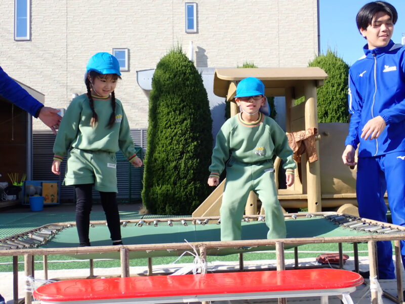 「タッチする」、「逃げる」、「助ける」の3つを考えながら動かなくてはいけない鬼ごっこ。最初は、ピンクチームがみんな白帽子チームにタッチされてしまいまし💦。「もう1回。」・・・追いかける後ろからタッチされちゃった(>_<)。でも、今度は、同じチームのお友だちが助けに来てくれて「やったぁ!。」。後ろも気にしてないとタッチされちゃう。1回ご終わるごとに「ハァハァ」と息が上がるおともだち。でも、楽しくて「もう1回!」。タッチされたら、動きを見ながら「〇〇ちゃん助けて!」と、同じチームのお友だちを呼ぶ声が出る様になって「それいいね。」と、竜﨑先生。やればやるほど面白くなってきたようでしたが、「トランポリンもやりましょう。」と、終了。とっても楽しかったね(#^.^#)。