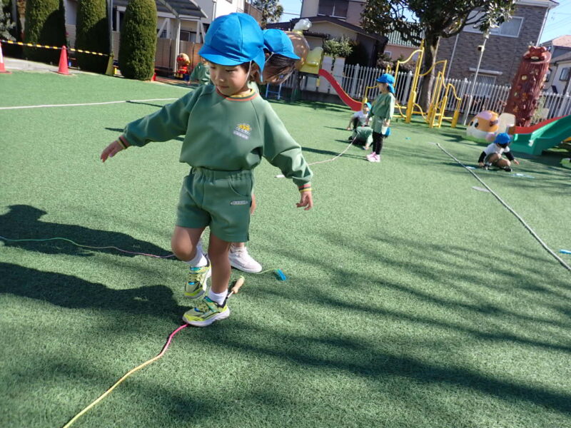 緊張した後の、楽しい体育あそび。最初は、縄跳びの縄を使ったあそびです。縄を長くのばして、片足跳びや両足跳び。縄の端から端まで10回跳ぶチャレンジ。これが意外と難しく。殆どのおともだちが、勢いで跳んで5~8回くらいで反対側に着いてしまい、何回もチャレンジしていました。「意外と頭を使わないと出来ないんです。」と、竜﨑先生。いつも楽しい遊びを紹介して頂いています。